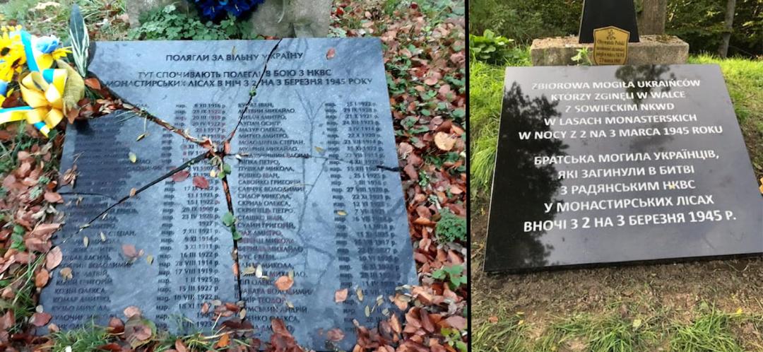 Na zbiorowej mogile w Monasterzu była tablica z napisem informującym o Ukraińcach, którzy zginęli w walce z sowieckim NKWD na początku marca 1945 r. roku. Dwa tygodnie temu (21 kwietnia) Straż Graniczna powiadomiła policję, że pojawiła się nowa tablica z nowym napisem.