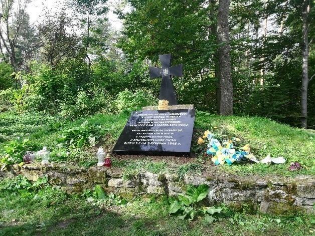 Na poprzedniej, po polsku i ukraińsku, było napisane: “Zbiorowa mogiła Ukraińców, którzy zginęli w walce z sowieckim KWD w lasach monasterskich w nocy z 2 na 3 marca 1945 roku”.