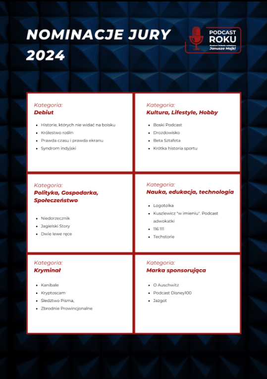 W tym roku 45-osobowe jury wybrało najlepsze podcasty spośród 324 zgłoszeń. Już niedługo, po ogłoszeniu 22 nominacji w 6 kategoriach tematycznych oraz głosowaniu internetowym publiczności, odbędzie się finał czwartej edycji Podcastu Roku, w trakcie którego zostaną wyłonieni zwycięzcy.