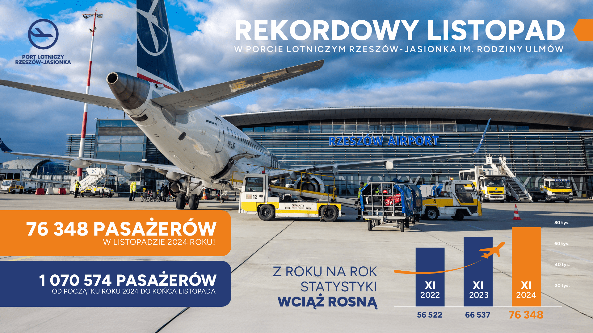 Ponad 76 tysięcy osób obsłużyło w listopadzie lotnisko w podrzeszowskiej Jasionce. To wynik o 19 procent lepszy od ubiegłorocznego. Do końca listopada odprawiono już 1,07 miliona osób – podkarpacki port lotniczy wyśrubuje więc roczny rekord, który w 2023 r. wynosił 1,02 mln.
