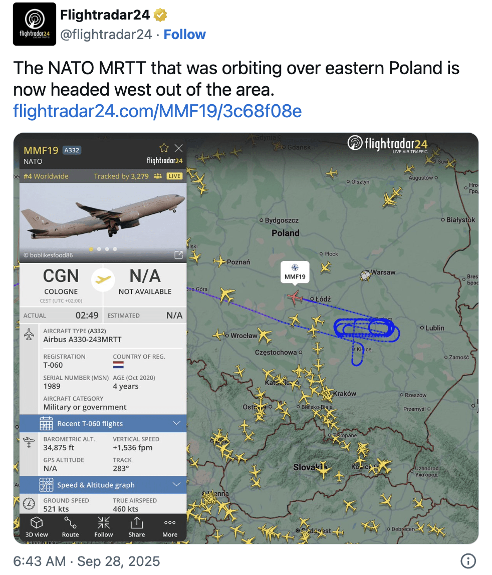 Mieszkańcy regionu oraz analitycy na całym świecie mogli na żywo śledzić kluczowy element tej operacji. Był nim wielozadaniowy samolot NATO Airbus A330 MRTT (o sygnale MMF19). Zapisach z radarów wskazują, że maszyna przez kilka godzin krążyła po stałej, eliptycznej trasie nad Polską.