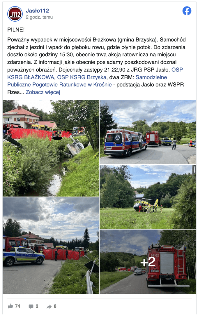 Wypadek wydarzył się koło godziny 15:30. Na miejsce natychmiast zadysponowano liczne siły i środki ratunkowe, w tym zastępy Państwowej Straży Pożarnej z Jasła i OSP Błażkowa oraz Brzyska. Dwa Zespoły Ratownictwa Medycznego, a także śmigłowiec Lotniczego Pogotowia Ratunkowego „Ratownik 10” z Sanoka, również dołączyły do akcji.
