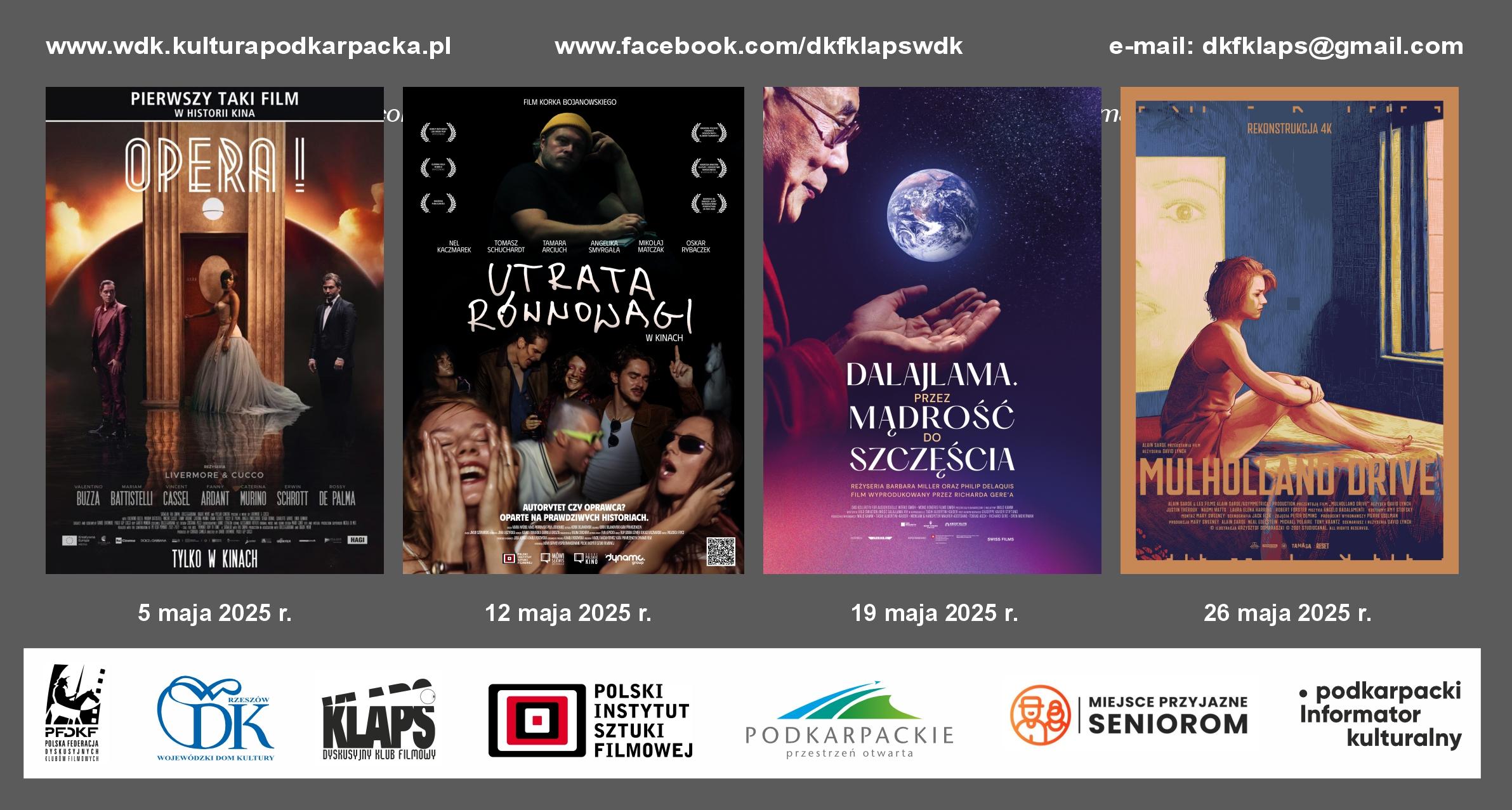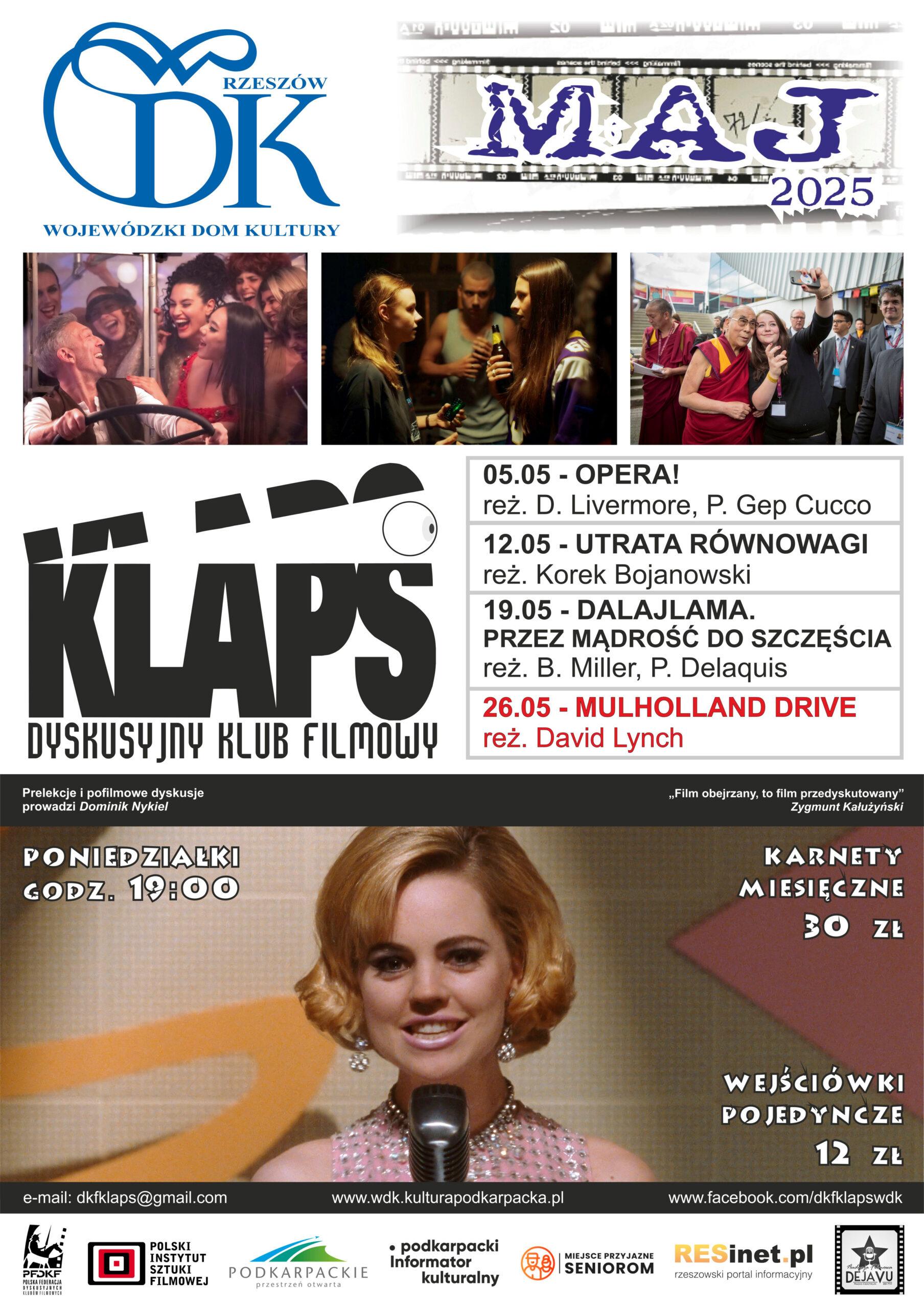 Cztery wyjątkowe filmy obejrzą w maju miłośnicy kina w rzeszowskim Dyskusyjnym Klubie Filmowym „Klaps”. WDK przygotował repertuar łączący głośny polski debiut, włoską operę, dokument o Dalajlamie i kultowy thriller Davida Lyncha. Wszystkie seanse tradycyjnie poprzedzą prelekcje i zakończą dyskusje.