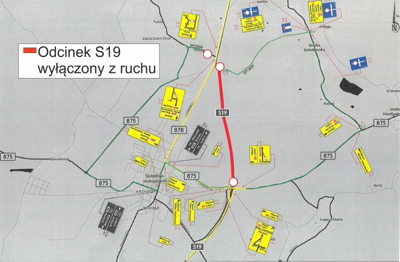 – ruch w kierunku Rzeszowa przekierowano z DK 19 na DW 878 do Sokołowa Młp., a następnie DW 875 do węzła Sokołów Młp. na S19.