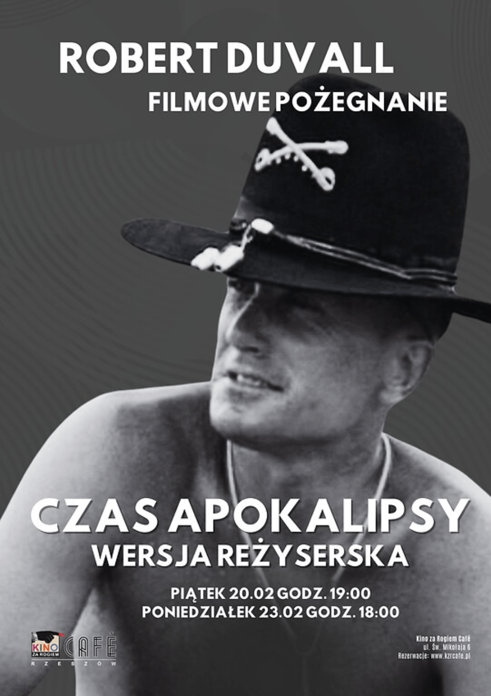 Scena ta do dziś pozostaje symbolem szaleństwa i surrealizmu wojny w Wietnamie. Widzowie będą mogli zobaczyć Duvalla na ekranie u boku takich gwiazd jak Marlon Brando czy Martin Sheen podczas dwóch pokazów: 20 lutego (godz. 19:00) oraz 23 lutego (godz. 18:00). Bilety na to filmowe pożegnanie dostępne są w cenie 20 zł.