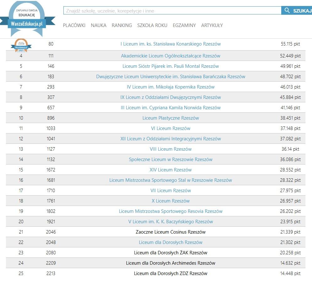 Oto pełna lista rzeszowskich liceów według kolejności w rankingu ogólnopolskim: