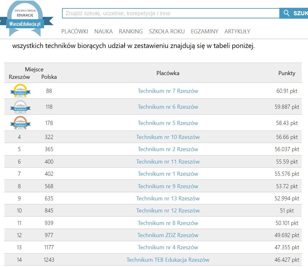 W tegorocznym rankingu znalazło się 14 techników z Rzeszowa. Oto pełna lista według kolejności w zestawieniu ogólnopolskim: