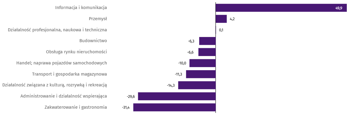 Największy wzrost wynagrodzeń dotyczył administrowania i działalności wspierającej (+19,9 proc.), obsługi rynku nieruchomości (+12 proc.) i działalności profesjonalnej, naukowej i technicznej (+11,1 proc.). W przemyśle płace poszły w górę o 9,2 proc., w gastronomii o 8,4 proc., a w kulturze i rekreacji o 8,3 proc. Płace wzrosły też w handlu (+7,9 proc.), transporcie i informacji (+5,5 proc.) oraz w budownictwie (+4,9 proc.).