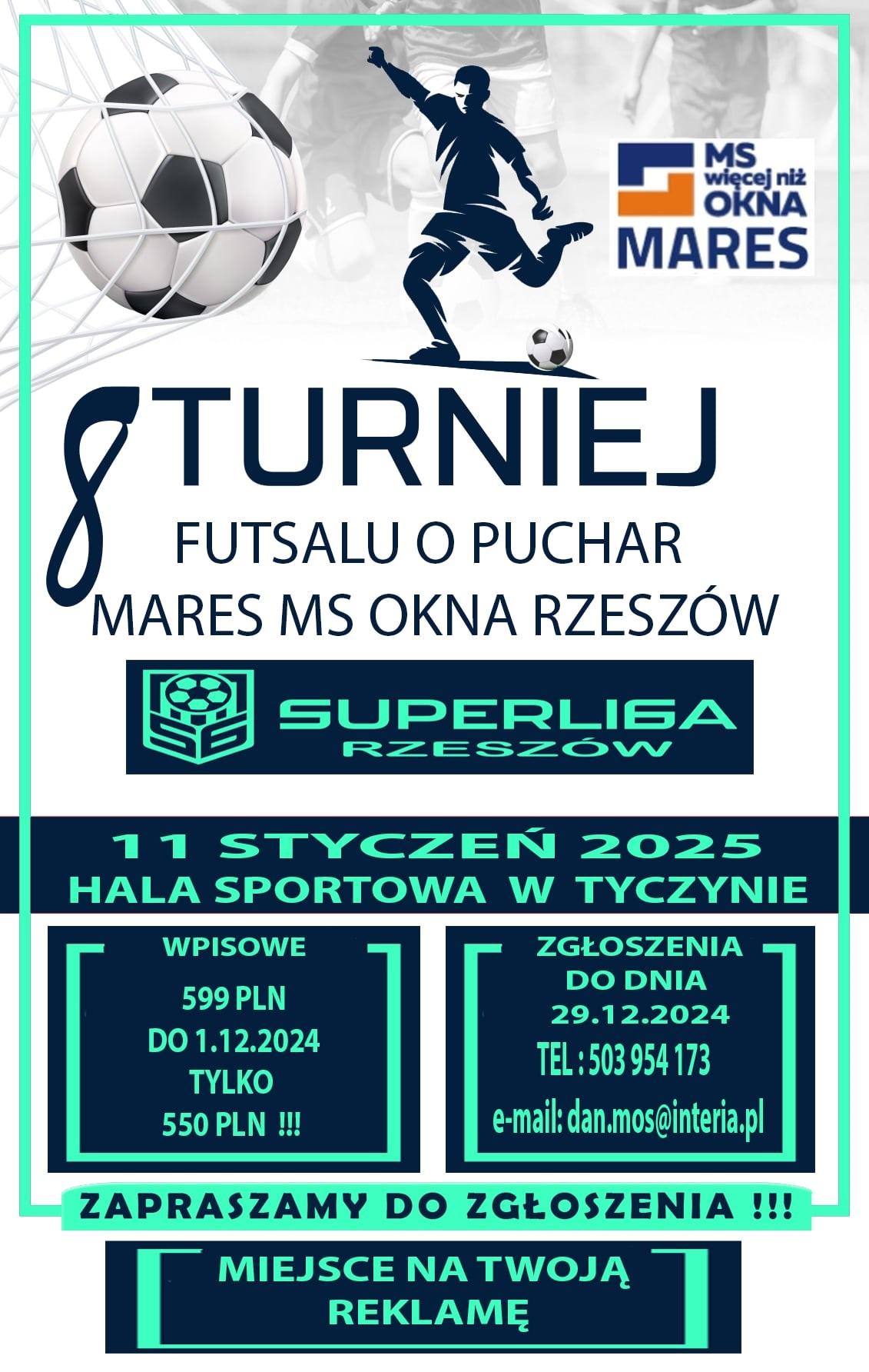 Piłkarska Liga Szóstek – Super Liga Rzeszów zaprasza na VIII turniej futsalu o Puchar MS Okna Mares Rzeszów. Zawody odbędą się w tyczyńskiej hali sportowej.