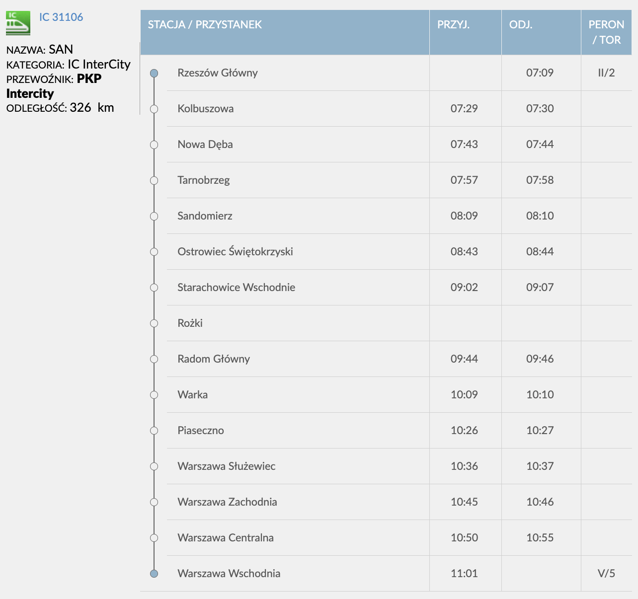 Intercity San wyrusza codziennie z Rzeszowa Głównego o 7:29 i dociera do Warszawy Centralnej o 10:50.