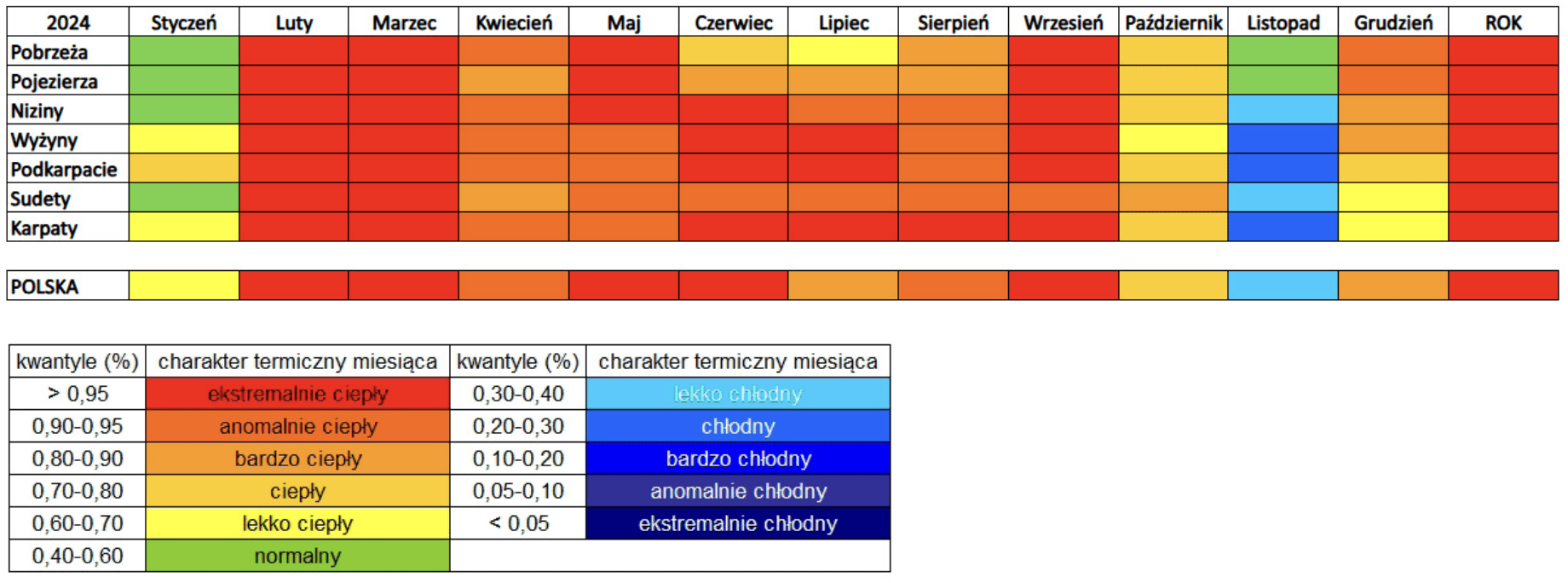 Najcieplejszym regionem Polski było Podkarpacie, gdzie średnia obszarowa temperatura powietrza (6,6°C) była o 6,6 stopnia (tak!) wyższa od normy, a warunki termiczne sklasyfikowano jako ekstremalnie ciepłe.