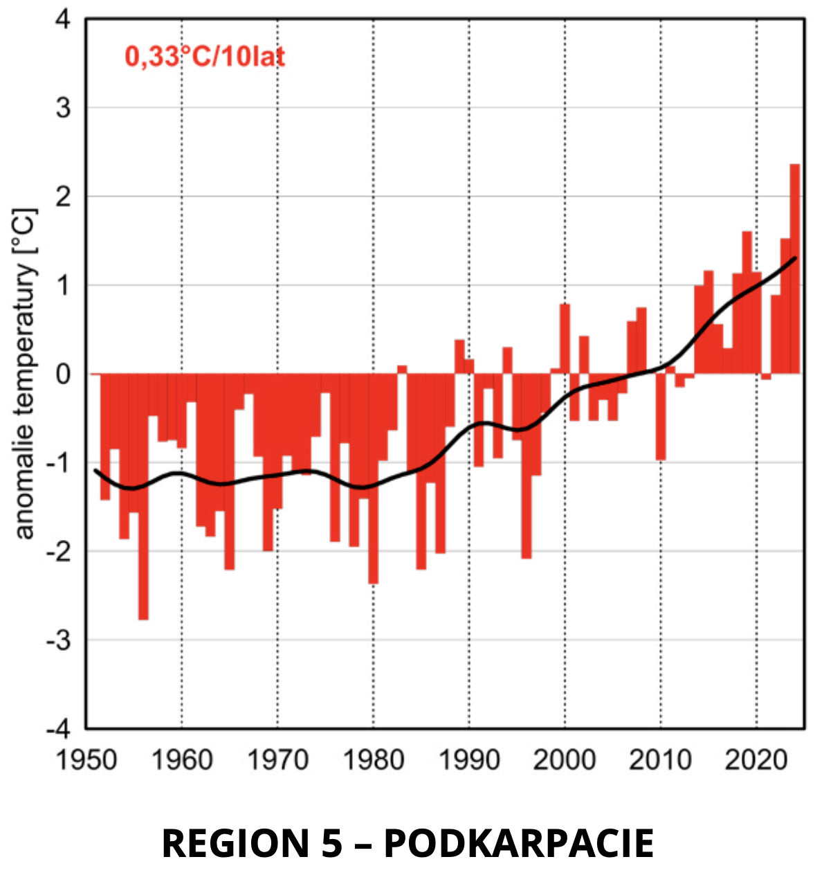 Średnia obszarowa temperatura powietrza w Polsce w 2024 roku osiągnęła 10,9°C, będąc o 2,2 stopnia wyższą od średniej z lat 1991-2020. Na tle całego kraju, Podkarpacie okazało się najcieplejszym regionem. Średnia roczna temperatura powietrza wyniosła tu 11,3°C, przekraczając normę dla tego obszaru aż o 2,3 stopnia. Co więcej, wzrost temperatury powietrza na Podkarpaciu, podobnie jak na Pojezierzach i w Karpatach, jest najsilniejszy w Polsce, przekraczając 2,4°C od 1951 roku.