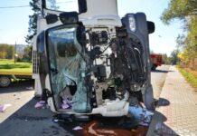Kierowca toyoty wymusił pierwszeństwo i spowodował zderzenie z ciężarówką i autolawetą. Strażacy musieli użyć specjalistycznego sprzętu, by uwolnić poszkodowanego kierowcę lawety.