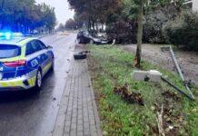 Pijany kierowca bmw uderzył w latarnię i drzewo. Okazało się, że był poszukiwany
