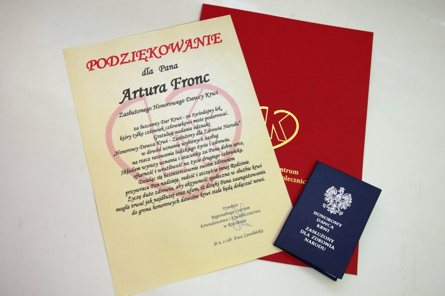 We wtorek w siedzibie Regionalnego Centrum Krwiodawstwa i Krwiolecznictwa w Rzeszowie Arturowi Froncowi uroczyście wręczono odznaczenie „Honorowy Dawca Krwi – Zasłużony dla Zdrowia Narodu”. Otrzymali je krwiodawcy, którzy oddali co najmniej 20 litrów krwi. Artur Fronc do takich krwiodawców należy – honorowo oddał już ponad 22 litry krwi.