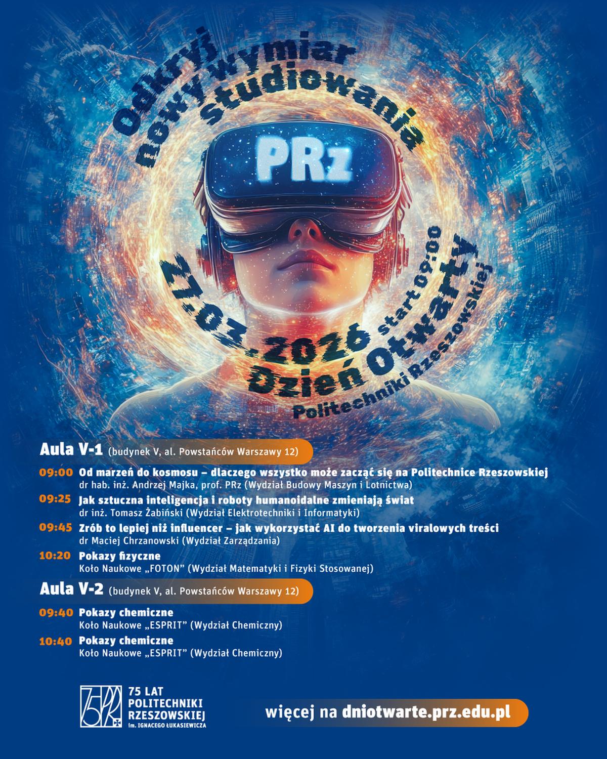 - 9:00. „Od marzeń do kosmosu – dlaczego wszystko może zacząć się na Politechnice Rzeszowskiej?”, dr hab. inż. Andrzej Majka, prof. PRz, Wydział Budowy Maszyn i Lotnictwa.