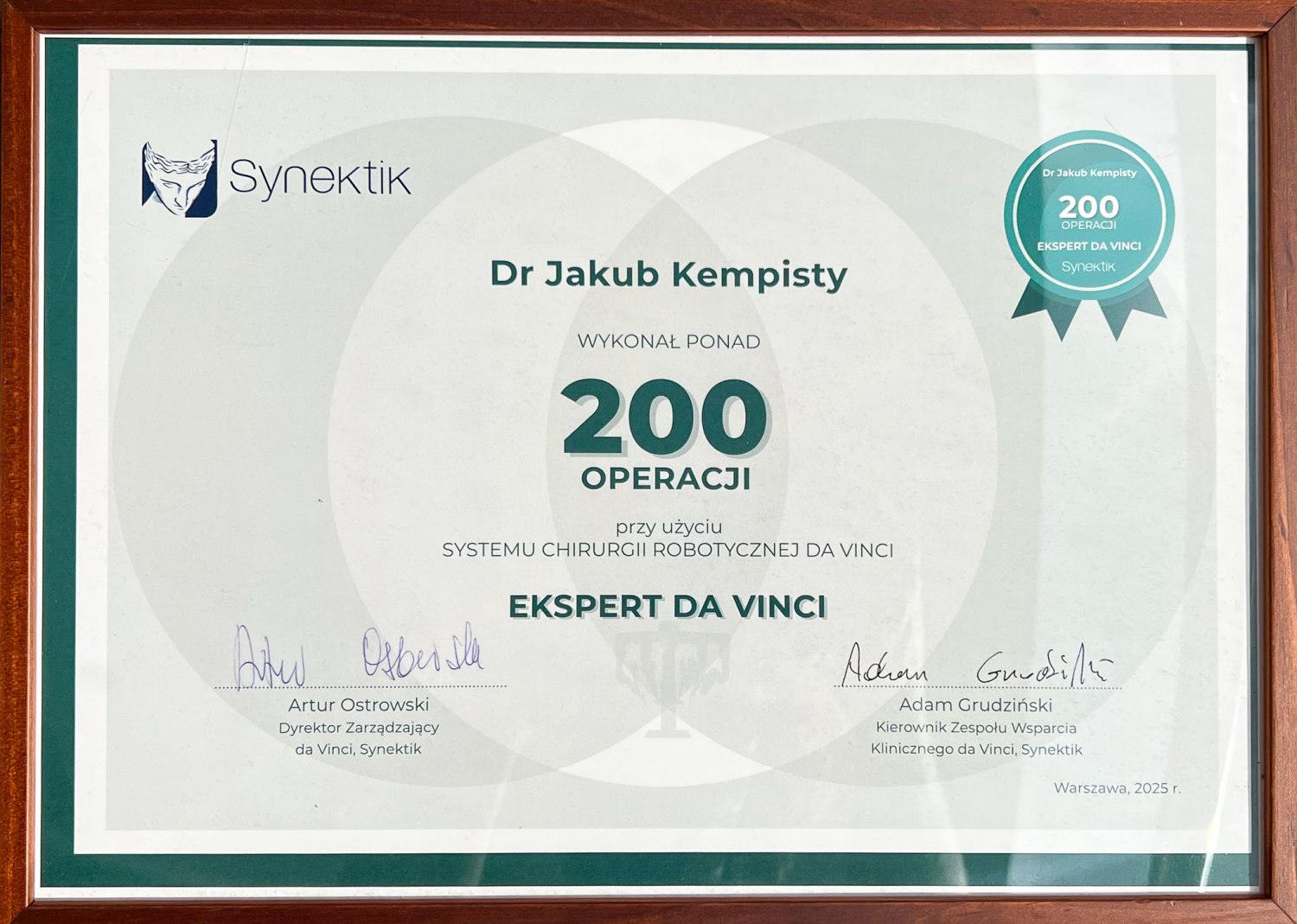 Jakub Kempisty jest specjalistą urologii z Kliniki Urologii i Urologii Onkologicznej w USK w Rzeszowie. Ceniony lekarz przekroczył ostatnio imponującą liczbę 200 operacji, których dokonał z użyciem robota da Vinci. Tak duże doświadczenie zaowocował też powołaniem na stanowisko pełnomocnika dyrektora ds. Podkarpackiego Centrum Chirurgii Robotycznej.