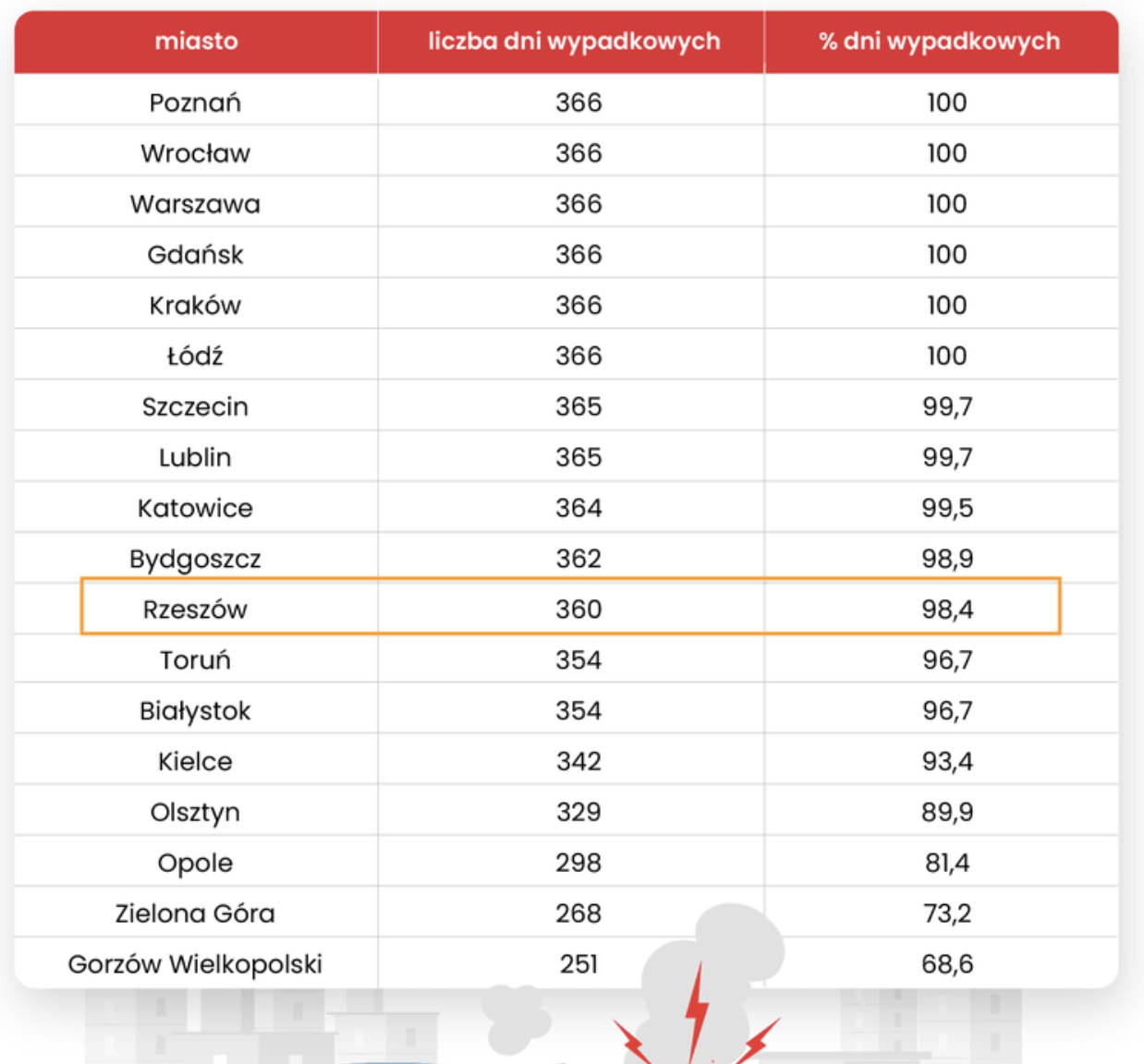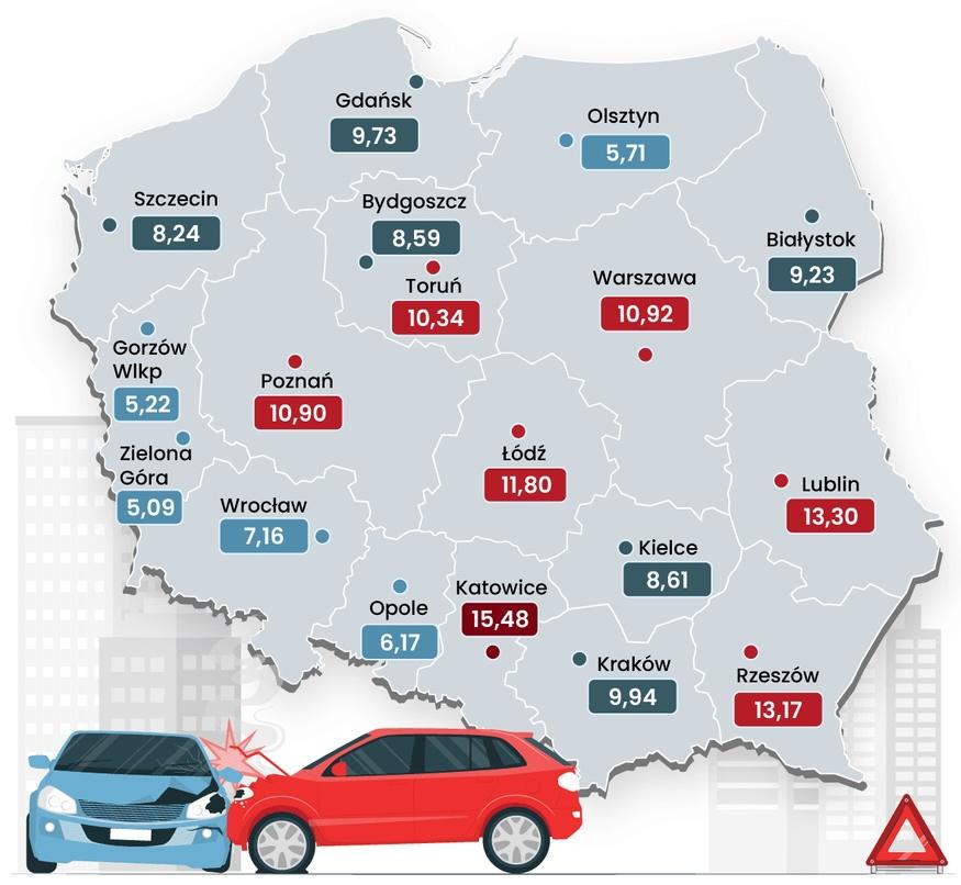 Najczęściej do takich incydentów dochodziło w dużych aglomeracjach, takich jak Warszawa, Poznań czy Wrocław. Jednak w przeliczeniu na liczbę mieszkańców Rzeszów znalazł się w ścisłej czołówce najbardziej wypadkowych miast.
