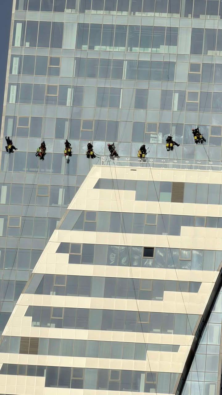 Ekipa sprzątająca pracuje w systemie zjazdowym, obsługując pas po pasie. Biorąc pod uwagę powierzchnię “Wieżowca W”, który liczy 41 pięter, pełne umycie fasady może zająć dużo, w zależności od warunków atmosferycznych.