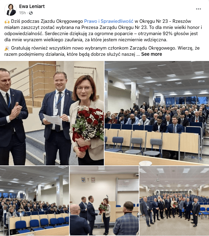 Leniart, która do tej pory szefowała PiS w całym województwie, zdobyła 184 głosy. Udział w głosowaniu wzięło 201 delegatów. Zdaniem nowej szefowej okręgu nr 23 “nie miała konkurenta w wyborach”.
