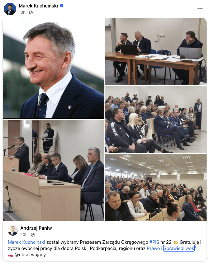 Z kolei w podkarpackim okręgu nr 22, który obejmuje m.in. Przemyśl i Krosno, prezesem został były marszałek Sejmu Marek Kuchciński. O wyborze zdecydowało 378 delegatów, którzy spotkali się w sobotę w Rzeszowie.