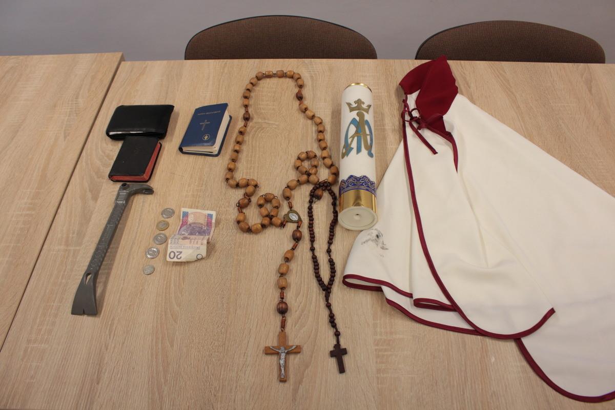 Policjanci ustalili, że sprawca odwiedził klasztor, aby się wyspowiadać, jednak zmienił plany. Najpierw usiłował zabrać datki z kościelnej skarbonki, a następnie ukradł przedmioty liturgiczne takie jak drewniane różańce, świecie i pelerynę.