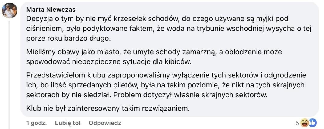 “Mieliśmy obawy jako miasto, że umyte schody zamarzną, a oblodzenie może spowodować niebezpieczne sytuacje dla kibiców. Zaproponowaliśmy klubowi wyłączenie skrajnych sektorów, jednak klub nie był zainteresowany takim rozwiązaniem” – napisała radna Marta Niewczas.