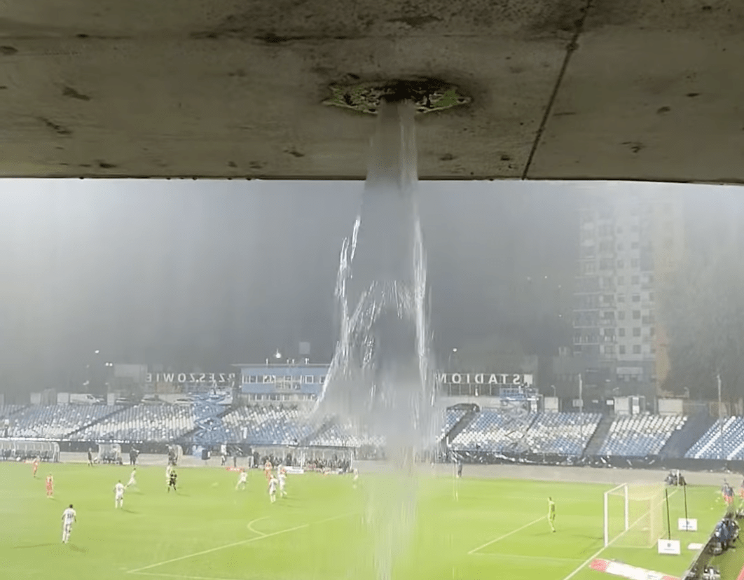 “Stan rzeszowskiego stadionu podczas opadów deszczu. Sytuacja miała miejsce we wrześniu 2024 r. ale nie sądzę, że cokolwiek do tej pory zostało poprawione, jeśli nawet wyczyszczenie krzesełek jest zadaniem zbyt trudnym dla zarządcy stadionu” – napisał internauta Szczepan.