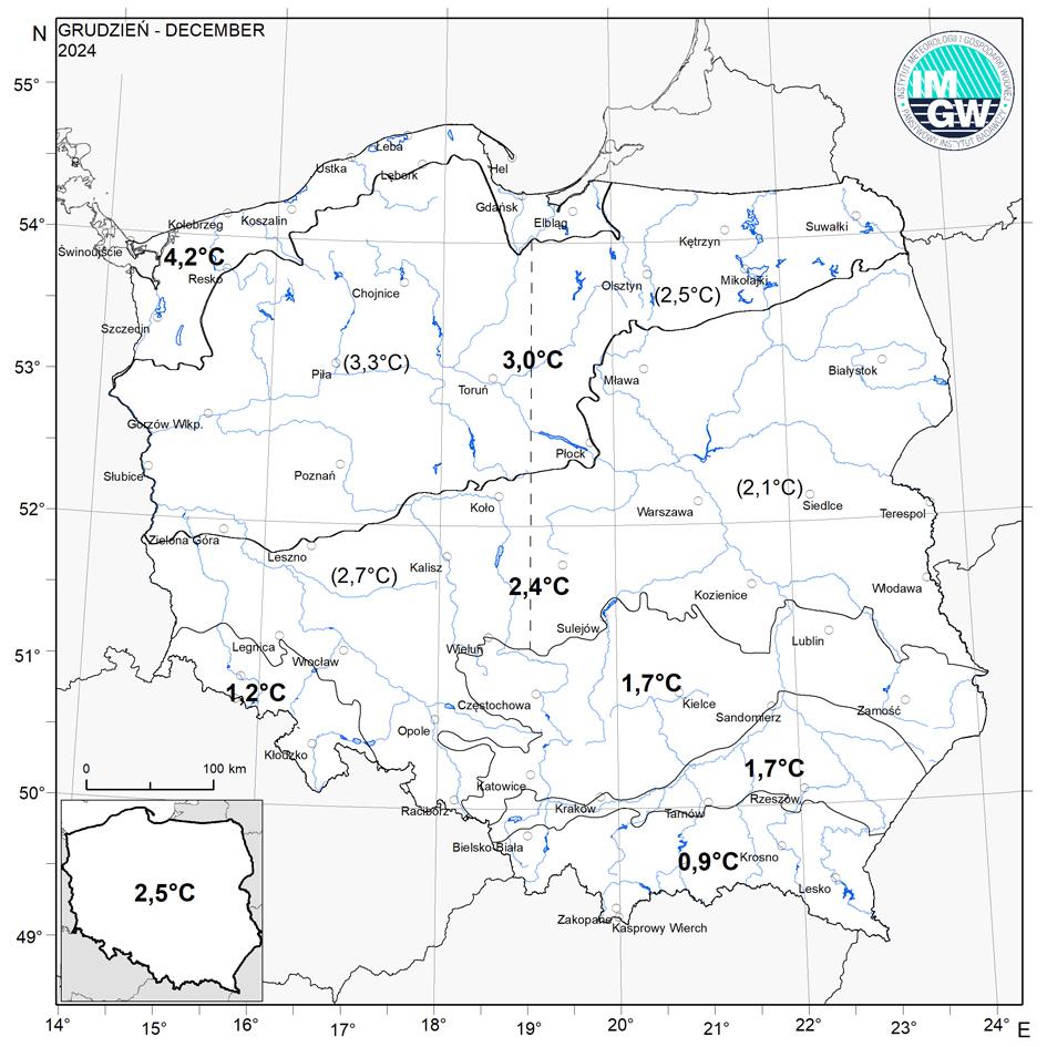 Średnia miesięczna temperatura powietrza w grudniu w 2024 r. w Polsce utrzymywała się w zakresie normy wieloletniej z lat 1991-2020 i wynosiła 2,5 stopni Celsjusza i była o 2,3 stopnia wyższa od średniej wieloletniej dla tego miesiąca.