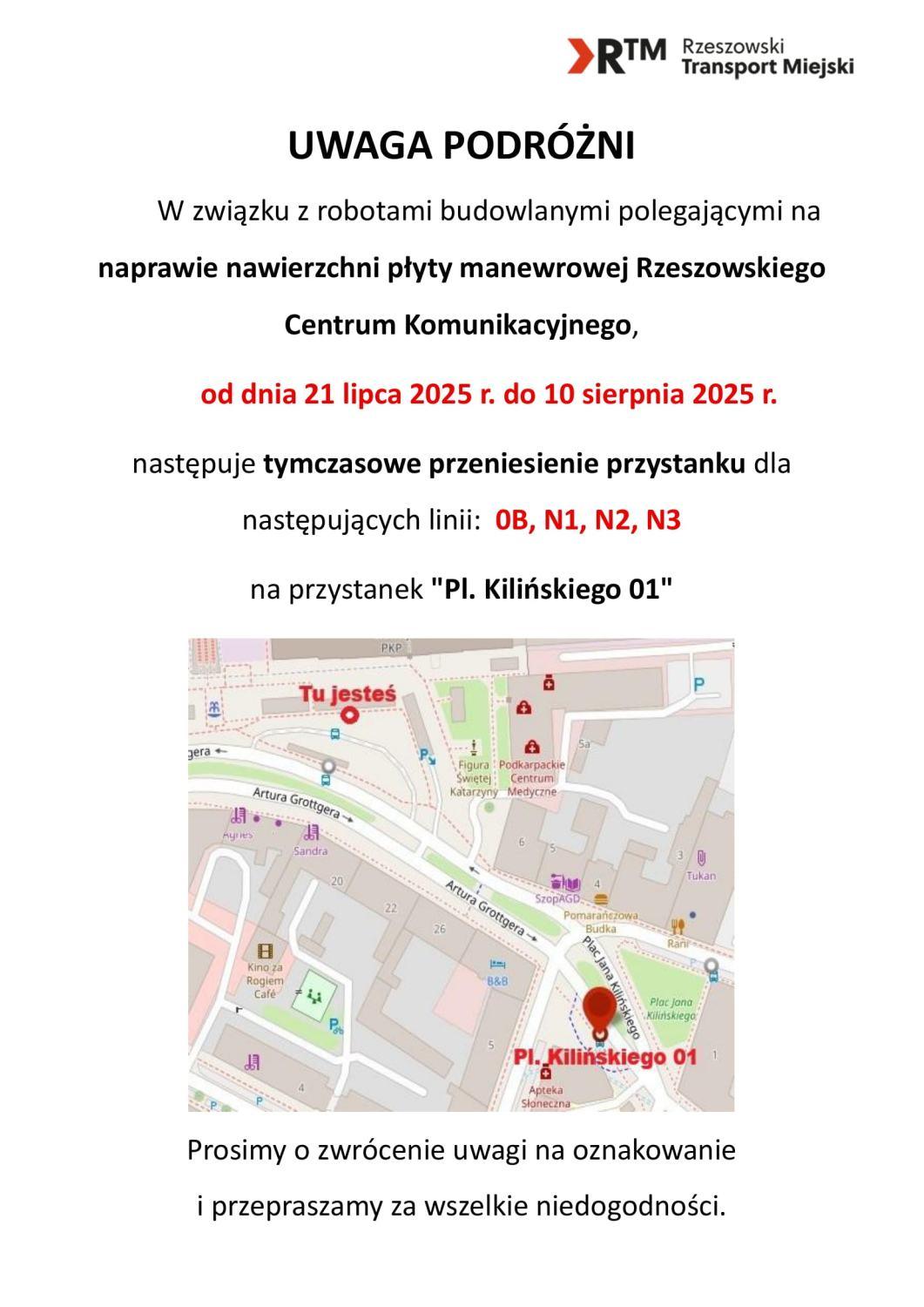 Zarząd Transportu Miejskiego informuje, że linia 0B będzie rozpoczynać kursy z przystanku Pl. Kilińskiego 01, a zakończy je na tymczasowym przystanku przy ul. Grottgera (dawny Dworzec Główny PKP 04). Linie nocne N1, N2 i N3 również będą odjeżdżać z Pl. Kilińskiego 01 zamiast z Placu Dworcowego.