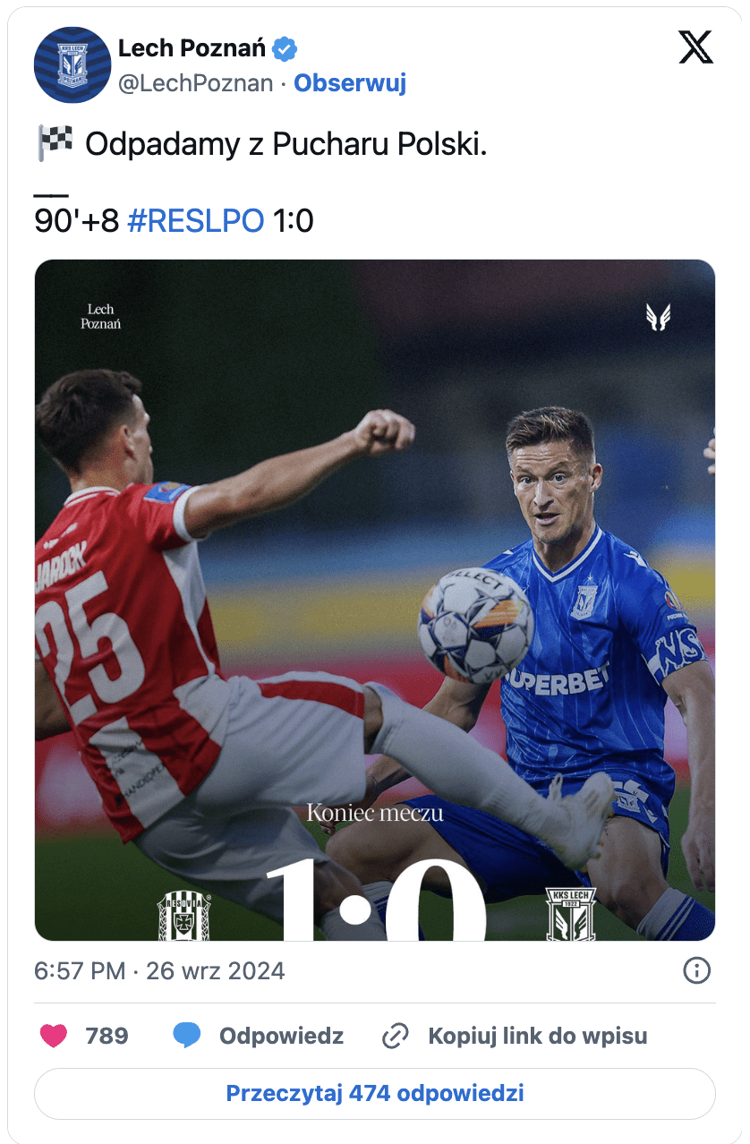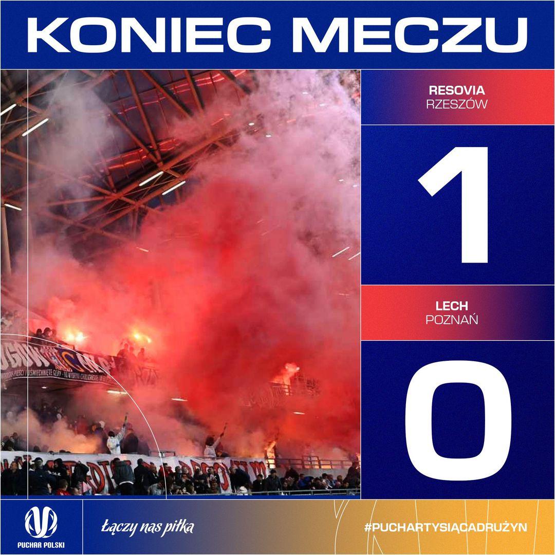 “Niestety, już na pierwszym przeciwniku potknęliśmy się w tej edycji Pucharu Polski i odpadliśmy tym samym z rozgrywek. W Rzeszowie lepsza okazała się Resovia, która wygrała 1:0 po golu Maksymiliana Hebela. (…) I tego dnia wracamy z centrum meczowym. Dobranoc.” – możemy przeczytać na stronie internetowej Lecha Poznań.