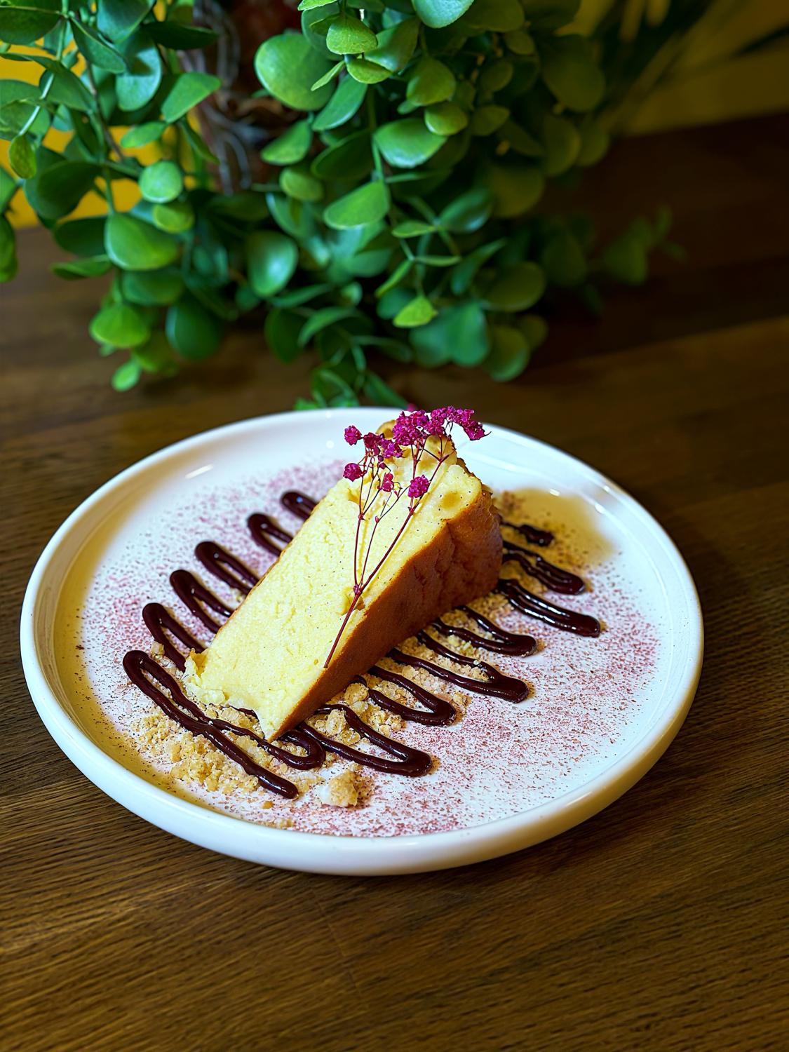 - Deser: Sernik baskijski cytrynowy – krem cytrynowy / kwiat bzu / beza.