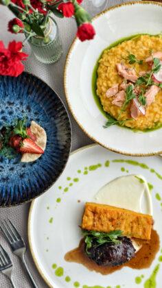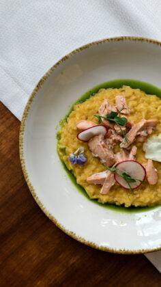 - Danie główne: Risotto dyniowe – łosoś sous-vide / wino białe / rzodkiewka / oliwa kolendrowa.