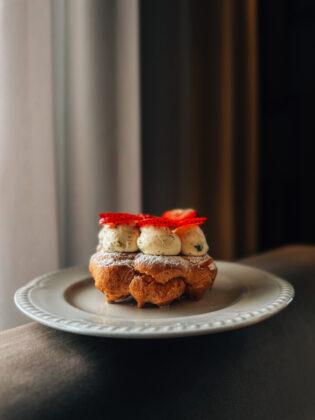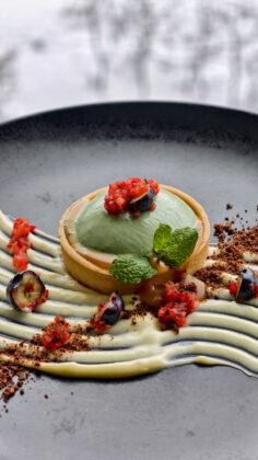 - Deser: Chrupiący ptyś z kremem pistacjowym i konfiturą z rokitnika.