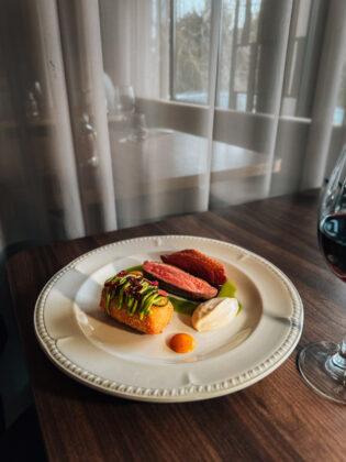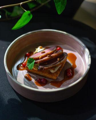 - Danie główne: Konfitowane udko z kaczki, pierożki z szarą renetą, buraki z malinami.