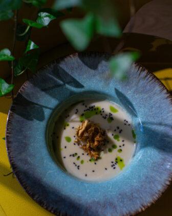 - Menu B. Przystawka: Krem z sałaty masłowej / por / nori / jajko przepiórcze / puder z katsuobushi / zioła.