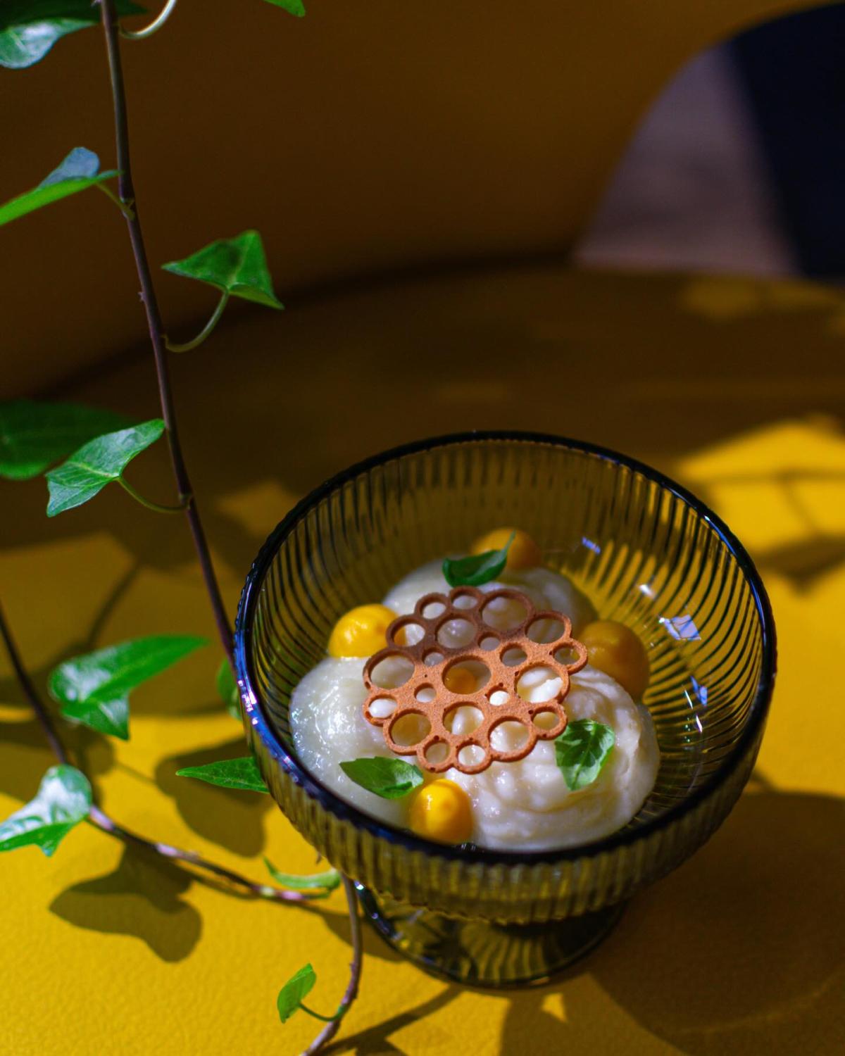 - Deser: Aksamitne semifreddo z kokosowym cukrem, sos z miodu akacjowego i octu balsamicznego, kruszonka z precla, daktyle (taki sam dla menu A i B).