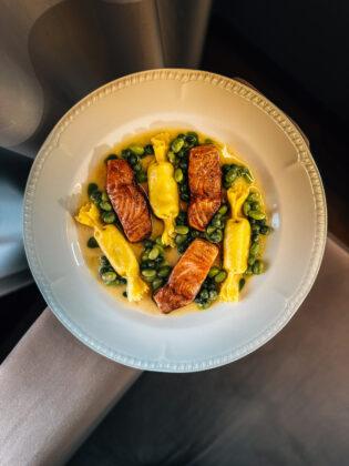 - Danie główne: Łosoś / ravioli z mascarpone i szpinakiem / groszek / edamame / beurre blanc / oliwa cytrynowa.