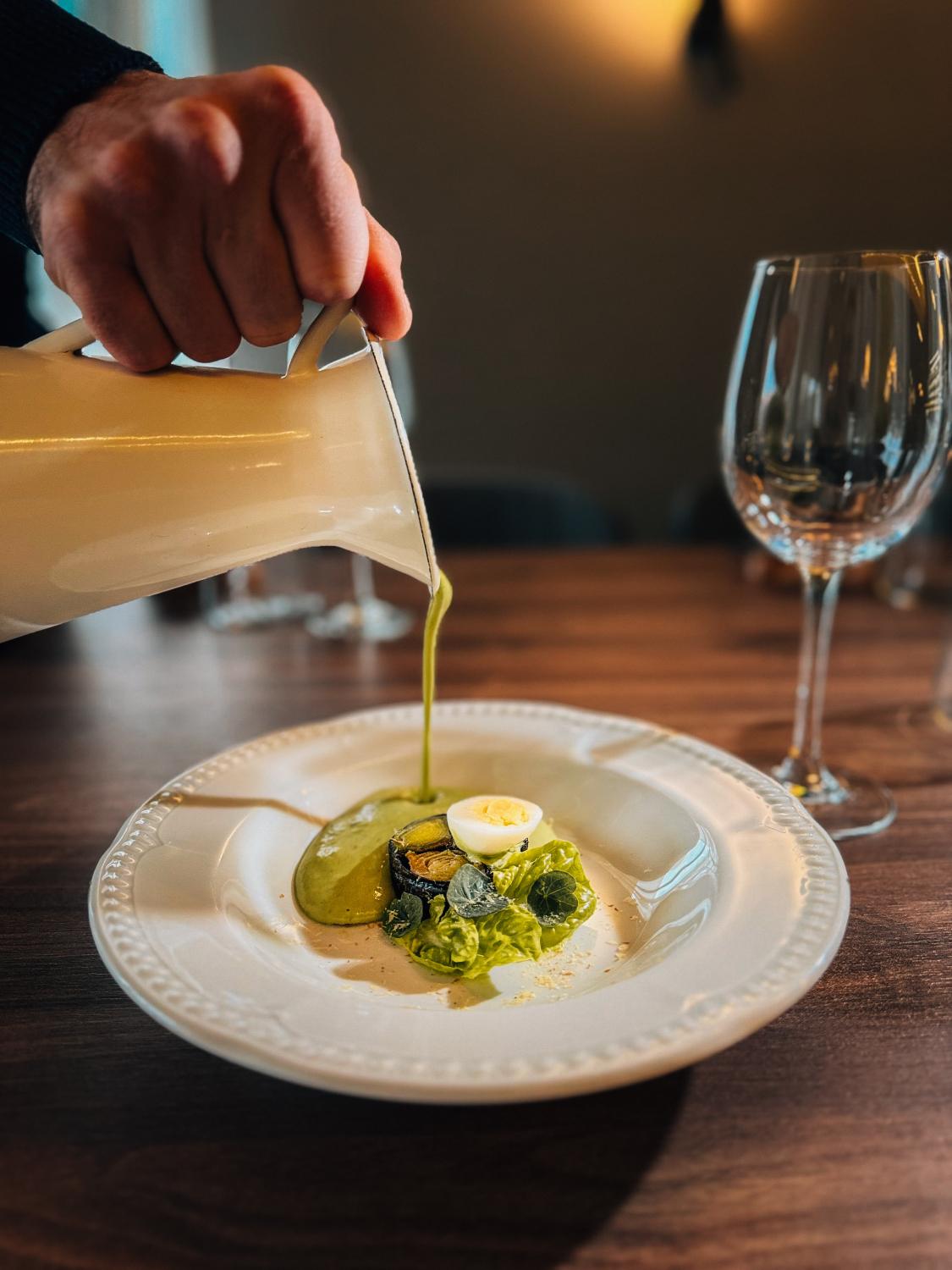 - Danie główne: Wolno duszona wieprzowina – babka ziemniaczana / dynia / ser pleśniowy / puree z kalarepy / oliwa pietruszkowa.