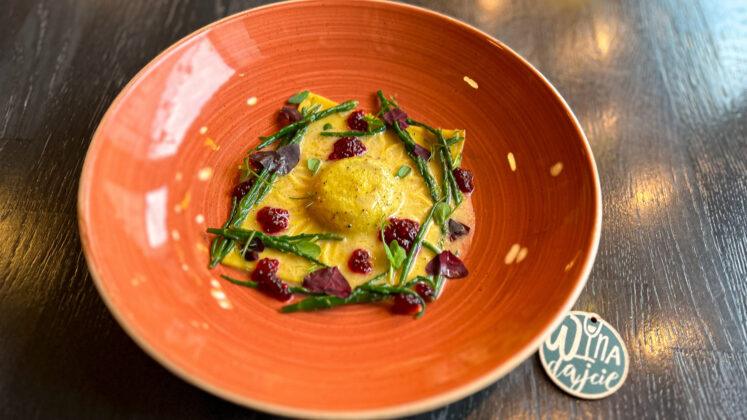 - Menu A. Przystawka: Raviolone z sarniną i warzywami podane z solirodem, kawiorem z buraków i sosem maślanym.