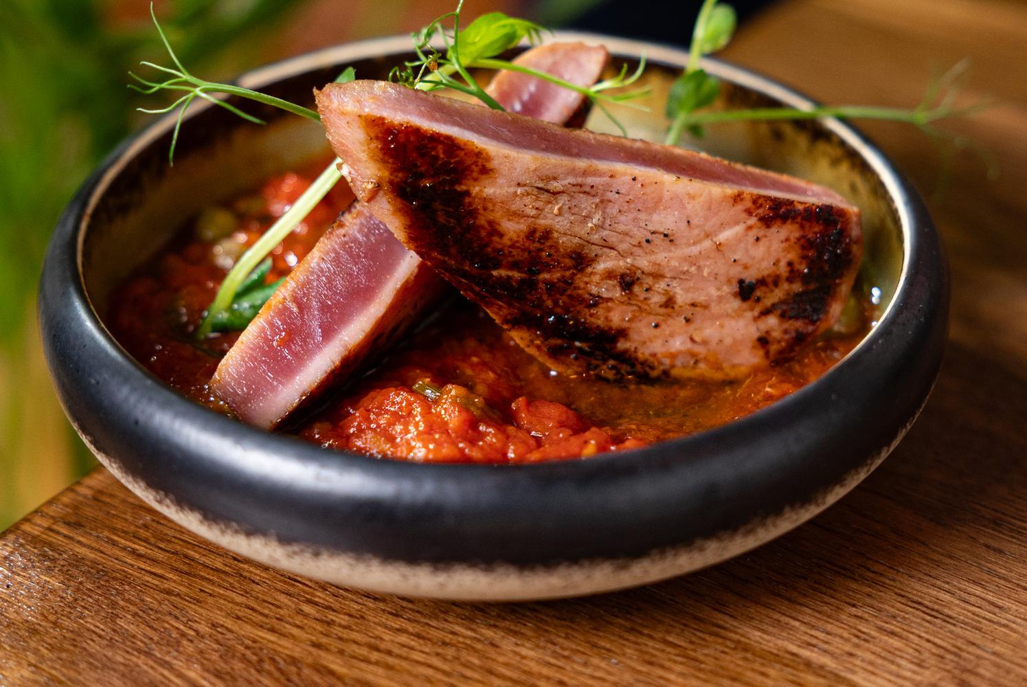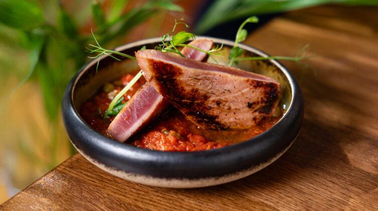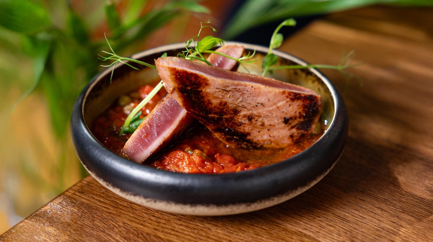 - Menu B. Przystawka: Swordfish Tataki – delikatnie marynowany miecznik, otoczony sezamem, podany z aromatycznym sosem ponzu na bazie yuzu i mięty.