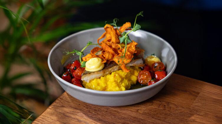 - Danie główne: Risotto szafranowe z okoniem morskim – majonez cytrynowy / salsa z pieczonych pomidorów / chips z marchewki.