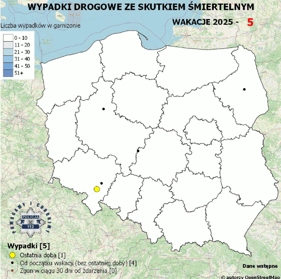 Schemat mapy Polski zawiera zamieszczone na niej punkty w kolorze czarnym i w kolorze żółto-czerwonym, które zaznaczają miejsce wypadku. Punkty w kolorze czarnym oznaczają miejsca, gdzie doszło do wypadków ze skutkiem śmiertelnym, od początku wakacji, natomiast punkty w kolorze żółto-czerwonym miejsca, gdzie w ostatniej dobie doszło do wypadków drogowych ze skutkiem śmiertelnym. Warto jednak pamiętać, że mapa ma charakter poglądowy.