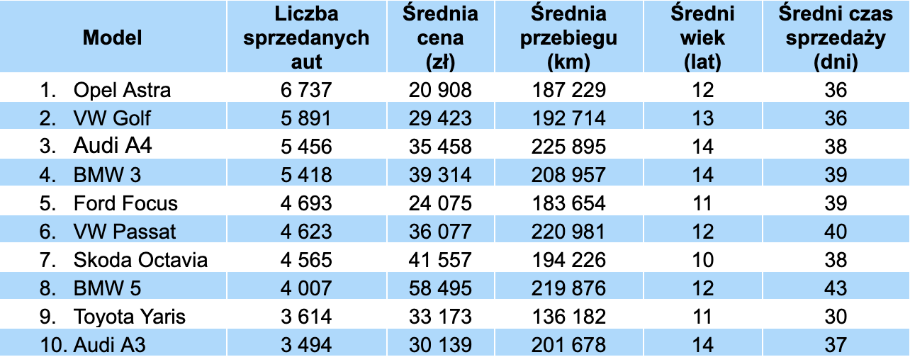 Jeśli chodzi o konkretne modele, na szczycie ogólnopolskiej listy popularności bez zmian króluje Opel Astra (średnia cena 20 908 zł). Na drugim miejscu znalazł się Volkswagen Golf (29 423 zł), a podium zamknęło Audi A4 (35 458 zł).