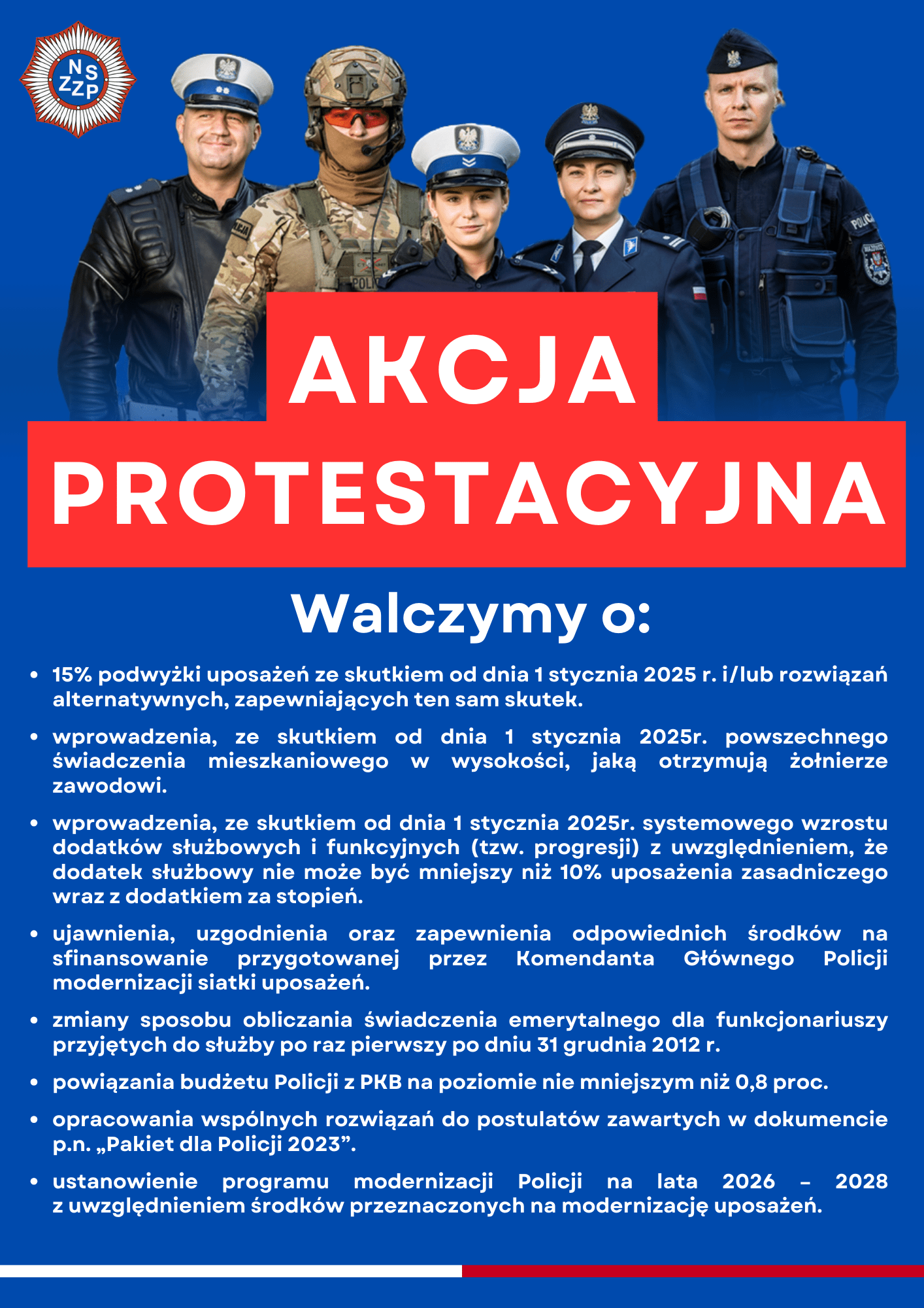 Główne postulaty NSZZ Policjantów to min. 15 proc. waloryzacja uposażeń od 1 stycznia 2025 roku, wprowadzenie systemu świadczeń socjalnych na wzór tych, które obowiązują w wojsku, systemowa zmiana siatki płac i progresja dodatków służbowych i funkcyjnych, zmiana sposobu obliczania świadczenia emerytalnego dla funkcjonariuszy przyjętych do służby po raz pierwszy po dniu 31 grudnia 2012 r., ustanowienie programu modernizacji Policji na lata 2026 – 2028 z uwzględnieniem środków przeznaczonych na modernizację uposażeń.