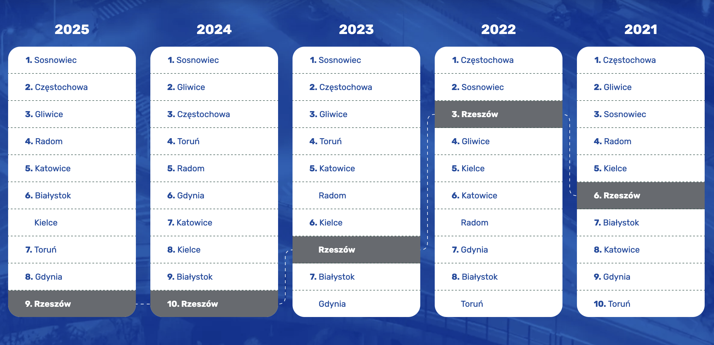 Stolica Podkarpacia powtórzyła tym samym niechlubny wynik z 2024 r., gdy również zajmowała ostatnie miejsce w grupie miast do 300 tys. mieszkańców. Oznacza to, że przez dwa lata z rzędu nie potrafiła poprawić swojej sytuacji komunikacyjnej. Stabilność wykazał za to Sosnowiec, który podobnie jak rok wcześniej triumfuje w kategorii mniejszych miast.
