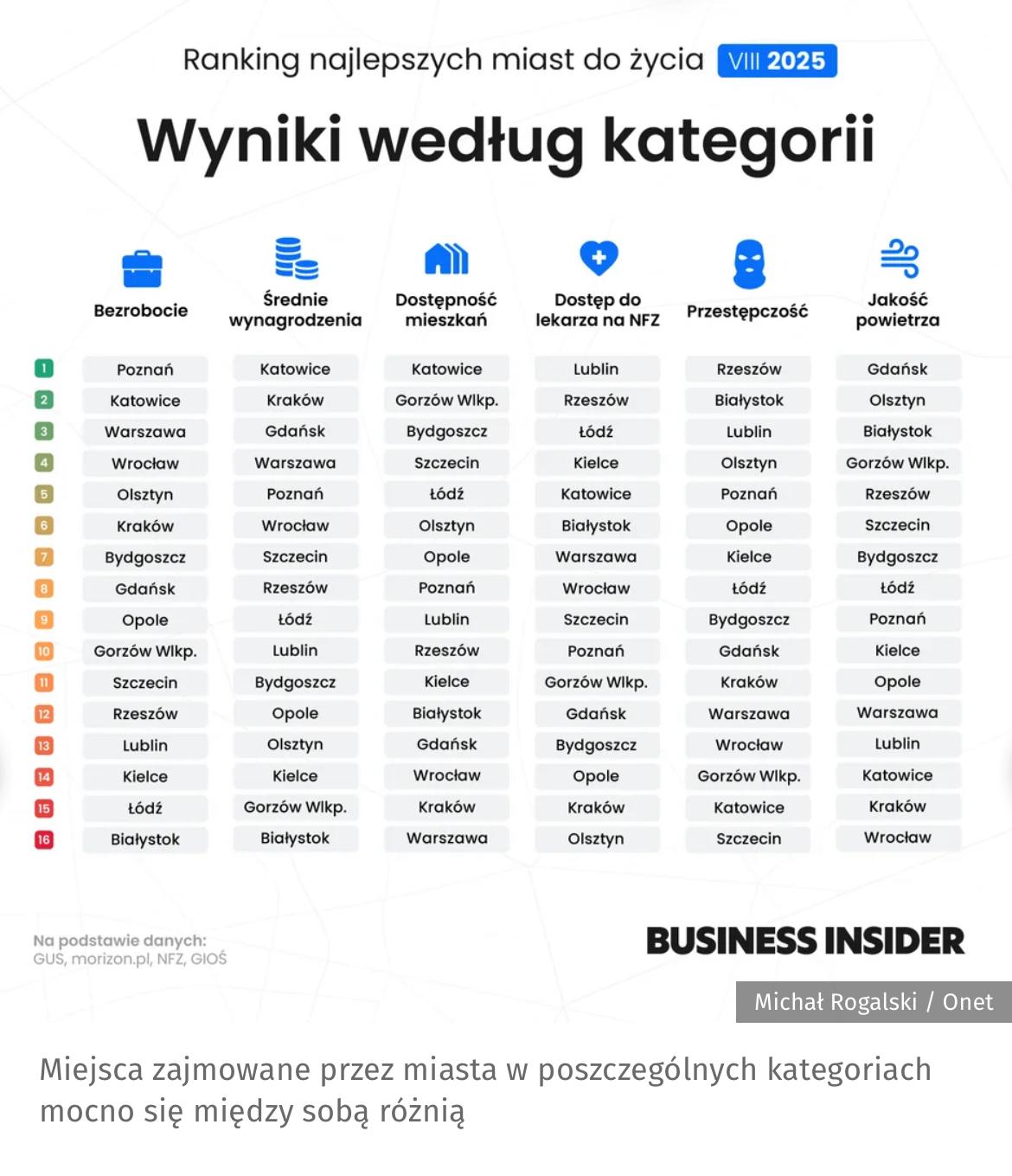 Business Insider aktualizuje zestawienie co pół roku. Bazuje na obiektywnych wskaźnikach z publicznych baz (GUS, NFZ, GIOŚ) oraz danych mieszkaniowych morizon.pl. W tej edycji Rzeszów zdobył 2. miejsce – z minimalną stratą do Katowic i wyraźną przewagą nad największymi polskimi metropoliami.