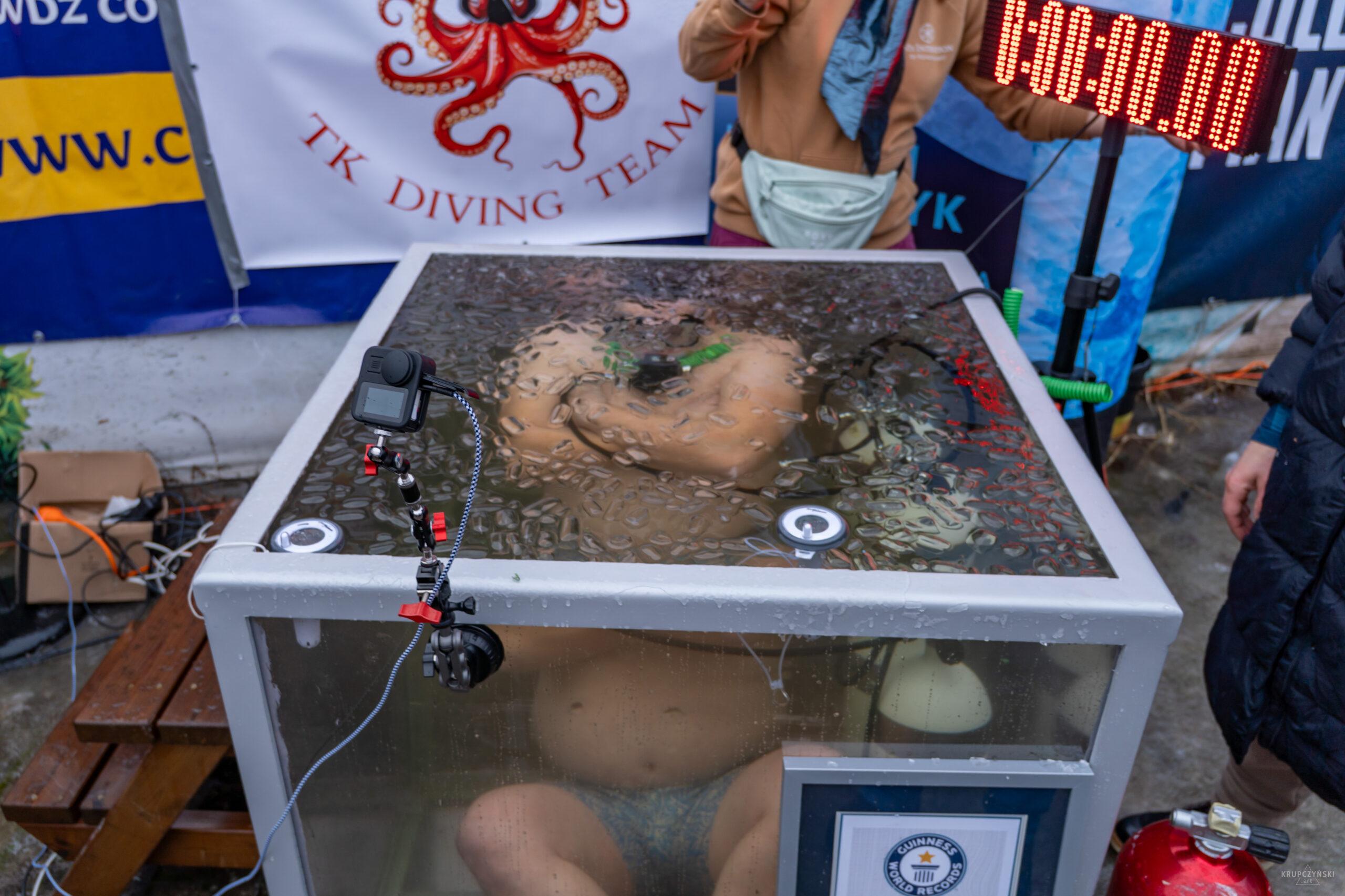 – Zanurzył się całkowicie w wodzie o temperaturze poniżej 4 stopni Celsjusza, łącznie z głową. Podczas próby oddychał przy użyciu aparatu oddechowego ze sprężonym powietrzem, stosowanego w nurkowaniu. Odliczanie czasu rozpoczęło się po pełnym zanurzeniu ciała – czytamy w nadesłanej nam relacji.