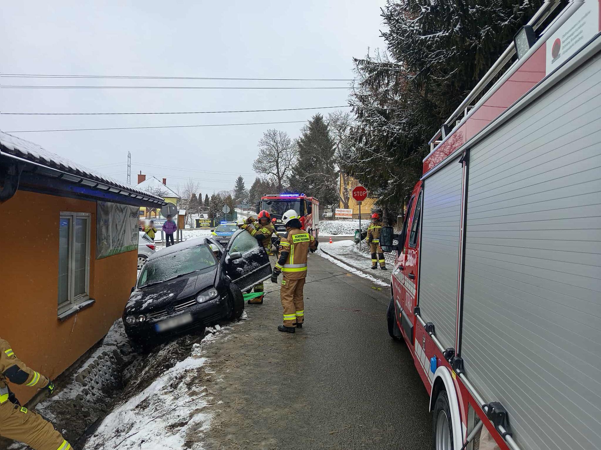 Po przybyciu na miejsce zdarzenia strażacy zastali samochód osobowy marki Volkswagen, który wpadł do przydrożnego rowu i uderzył w budynek.