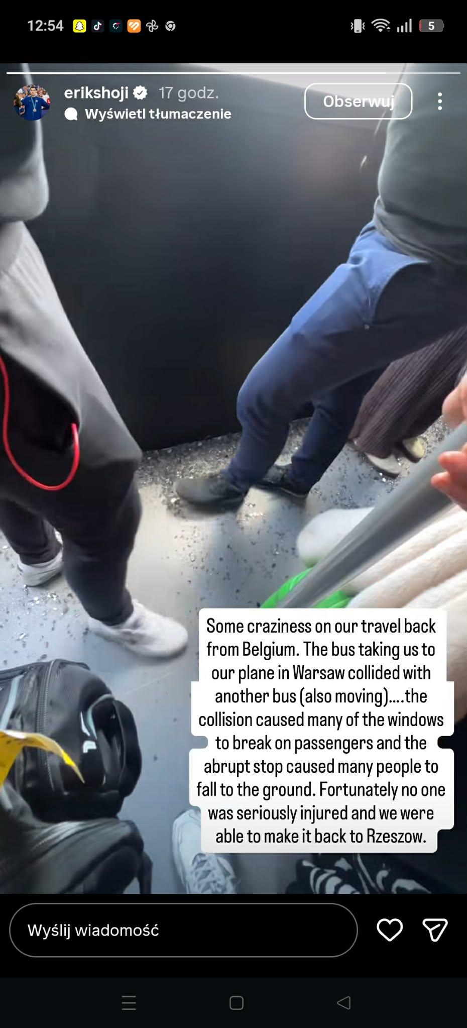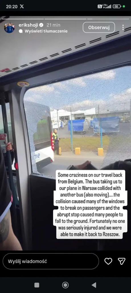 – Trochę szaleństwa w drodze powrotnej z Belgii. Autobus, który wiózł nas do samolotu w Warszawie, zderzył się z innym autobusem (również będącym w ruchu)… Kolizja spowodowała, że na pasażerów poleciało mnóstwo odłamków z rozbitych szyb, a gwałtowne zatrzymanie sprawiło, że wiele osób upadło na podłogę. Na szczęście nikt nie odniósł poważnych obrażeń i udało nam się wrócić do Rzeszowa – relacjonował na swoim profilu siatkarz.